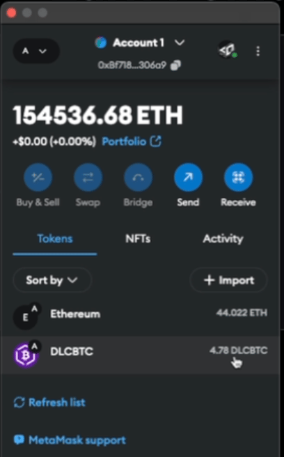 Alt Text: MetaMask wallet containing dlcBTC tokens